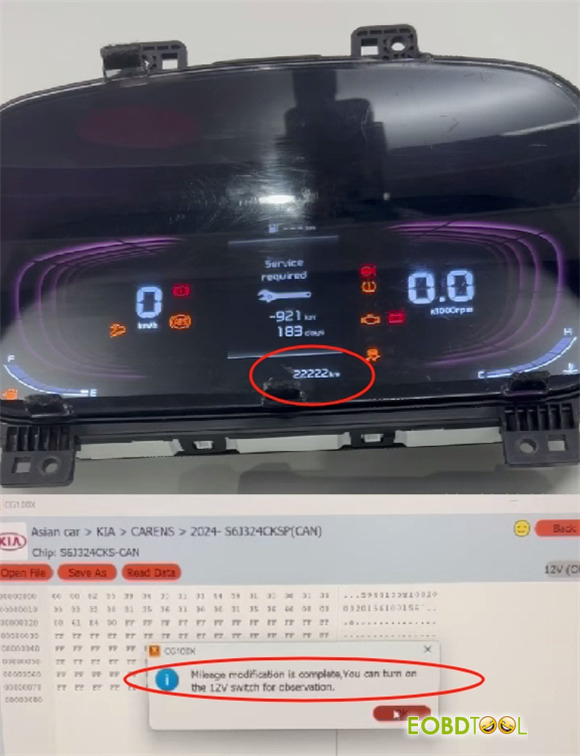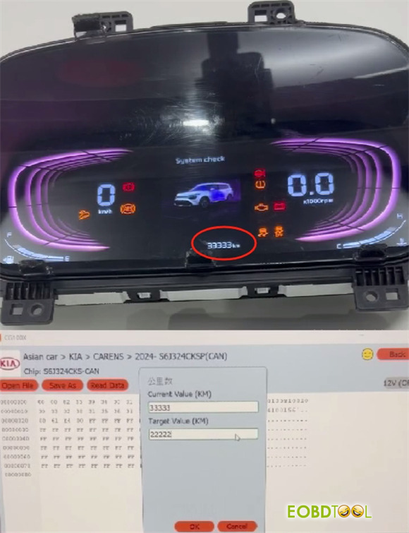 Successfully adjusted the odometer from 33,333 km to 22,222 km on a 2024 Kia Carens using CGDI CG100X Programmer through the CAN BUS method!