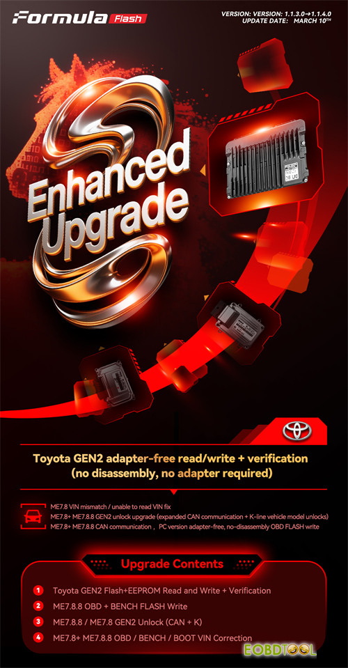 We are excited to announce a major upgrade to FormulaFlash ECU Programmer (version 1.1.4.0)- Toyota GEN2 tuning capabilities. This update focuses on simplifying the workflow for workshops and tuners by eliminating the need for adapters and disassembly, while expanding support for critical ECUs like ME7.8 and ME7.8.8.