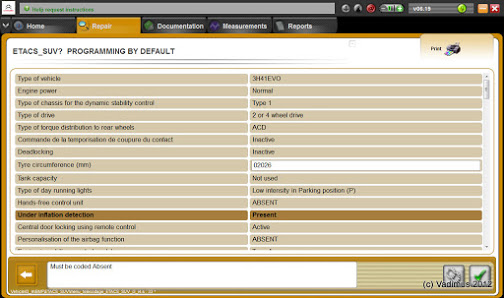 3) Come to the “ETACS-SUV? Programming by default” menu. Select “Under inflection detection”. TPMS is included the option. The current status is Present (ON)