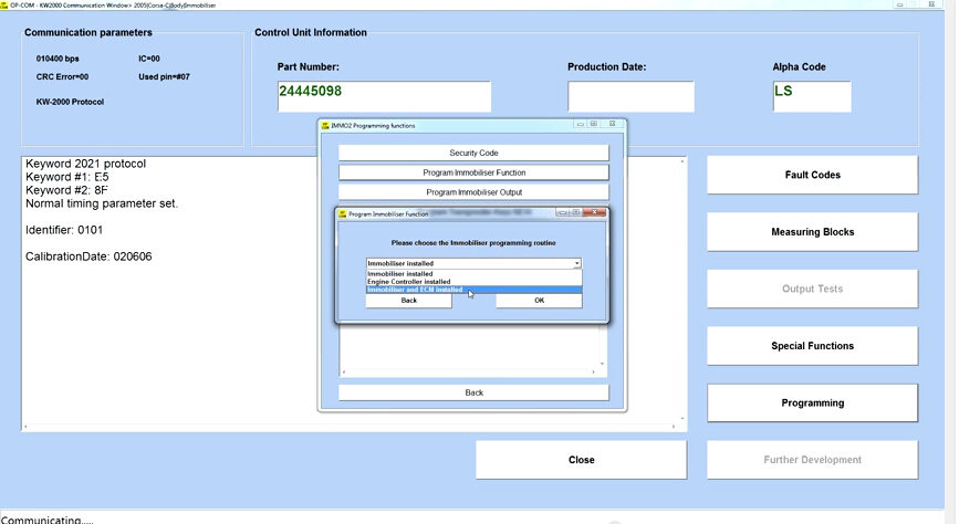 For example, select Program Immobilizer Function, choose Immobilizer installed from the drop-down list
