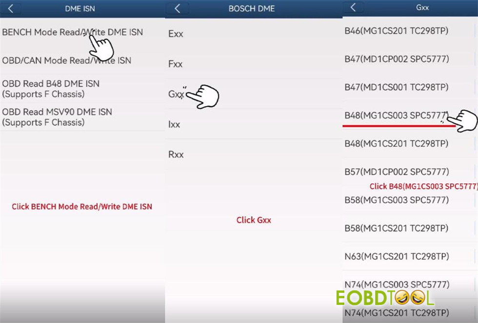 Select BMW → DME ISN → Bench Mode Read/Write DME ISN → BOSCH DME → Gxx → B48 ECU (e.g. MG1CS003 SPC5777).