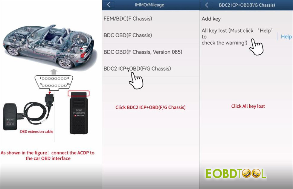 Select FEM/BDC → IMMO/Mileage → BDC2 ICP+OBD (F/G Chassis) → All Keys Lost.