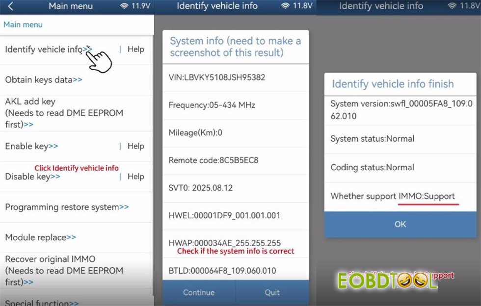Identify and save vehicle info. Verify that the IMMO type is supported.