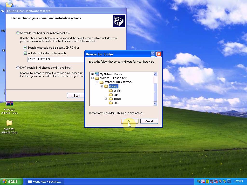 3. Tick on the second square for “Include this location in the search” and drowse for folder (My Network Places/ FMPC001 UPDATE TOOL/ FEMPC001 UPDATE TOOL/ drivers).