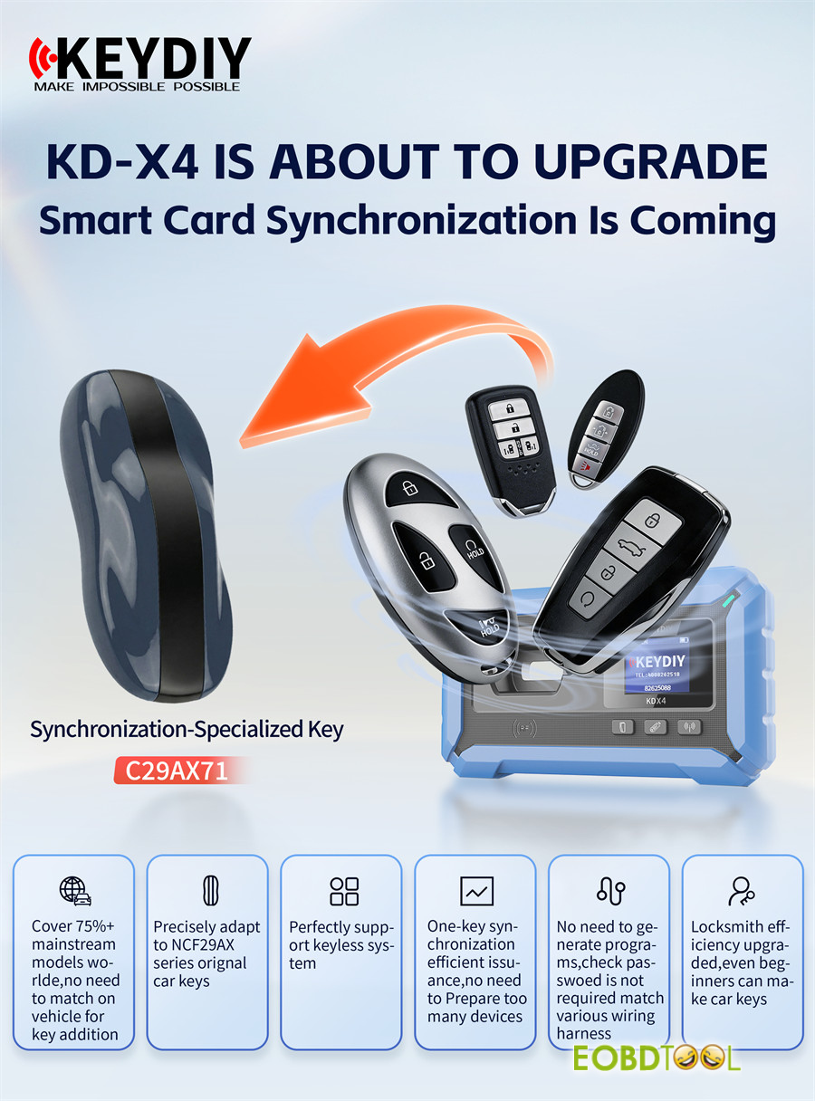 KEYDIY KD-X4 5-in-1 key programmer and KD-MAX now support NCF29AX series chip type synchronization. C29AX71 Synchronization-specialized Key is required. This lets you read original key data to copy or add smart keys.