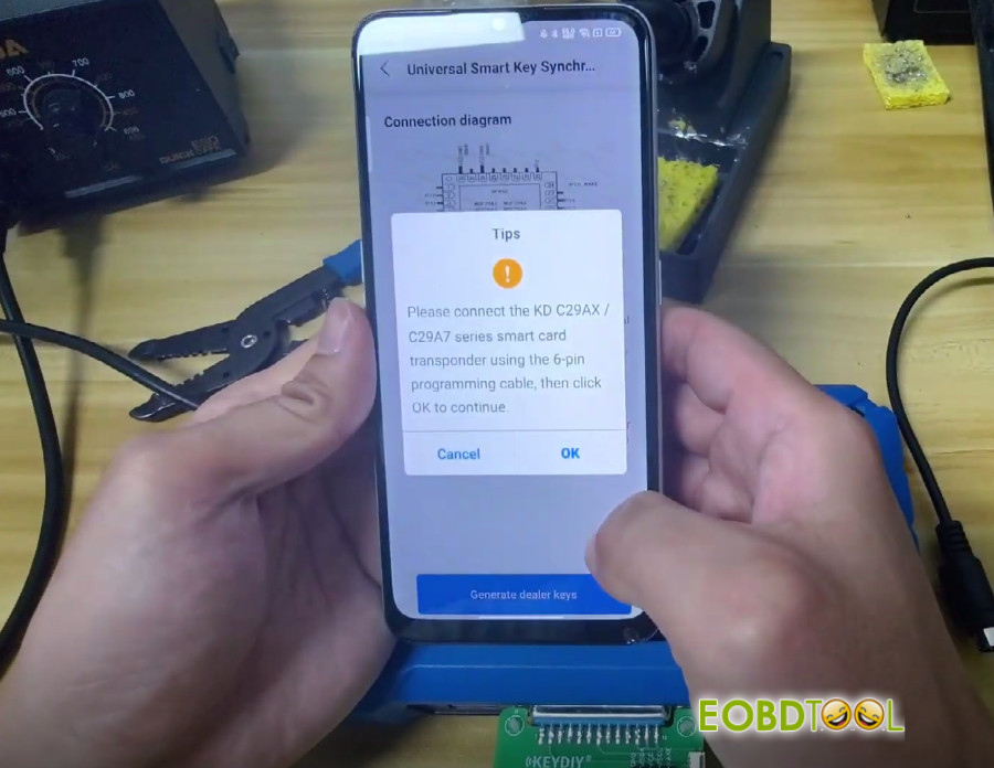 Use the 6‑pin programming cable to connect KD 29AX/29A7 smart card to your KD-X4 key programmer.
