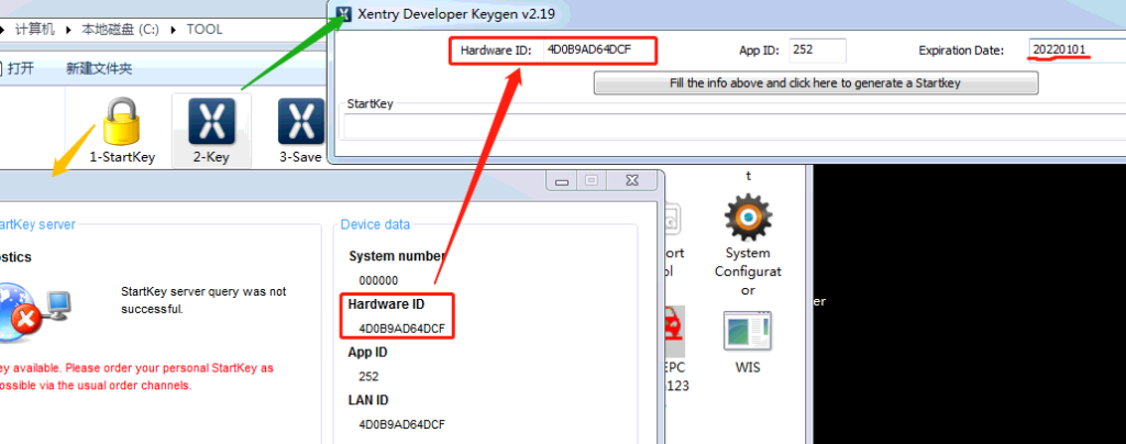 First open “1-StartKeyCenter” and “2-Key”, enter ID and date, finally press the rectangle button to gain registration code.
